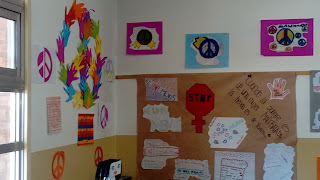 Se exponen trabajos de 1ro a 7 mo grado con la seño de Plástica Valeria y se hace lectura del cuento las mil grullas que fue trabajado en 4to grado con la seño Cecilia.